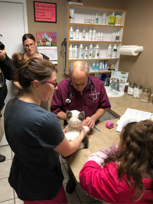 A Clínica Veterinária da Pioneer em Moses Lake, Washington, teve um dia interessante na sexta-feira. Parece que entre os cães e gatos e até as águias americanas que eles cuidaram nas últimas semanas, havia um tipo muito diferente de criatura peluda trazida por uma garotinha que tinha preocupações específicas próprias. A jovem Jazmine estava preocupada que seu gato Donnie não estivesse se sentindo bem com seu vigor habitual, e pediu a sua mãe que ligasse para o veterinário para ver se havia algo que pudessem fazer. Eles marcaram uma hora para Donnie entrar, o que foi um pedido bastante fácil, porque Donnie é um gato de pelúcia e, portanto, bastante portátil.