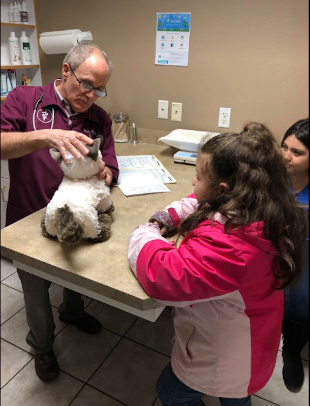 Tivemos uma menina maravilhosa que veio nos visitar ontem. Seis anos de idade Jazmine, que tem necessidades especiais, estava extremamente preocupado com seu gato de pelúcia "Donnie". Sua mãe nos ligou e marcou uma consulta para ela ser vista pelo Dr. Maier.